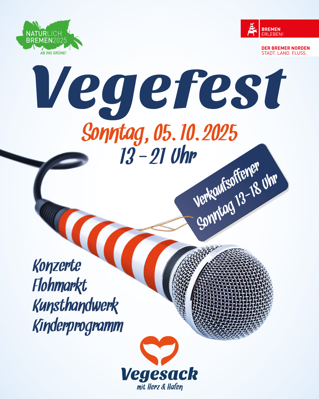 Am Sonntag, den 5. Oktober 2025, findet das Vegefest 2025 statt. Von 13 bis 21 Uhr lädt die Vegesacker Innenstadt zum Bummeln, Verweilen und Feiern ein. Ganz neu ist in diesem Jahr ist die verlängerte Festzeit: Erstmals klingt das Vegefest nicht mit Ende des verkaufsoffenen Sonntags aus, sondern es kann bis 21 Uhr gefeiert werden.